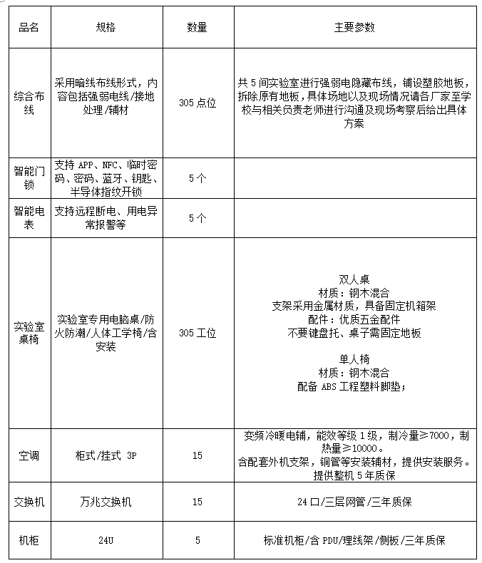 为提高全校实验室设备的利用率与管理水平,改善学校的实验室教室教学环境,实验实训中心拟开展实验室集成安装服务项目建设,详细内容见下表。现面向社会进行公开征集建设方案,欢迎符合资格条件的公司积极支持我校实验室建设。